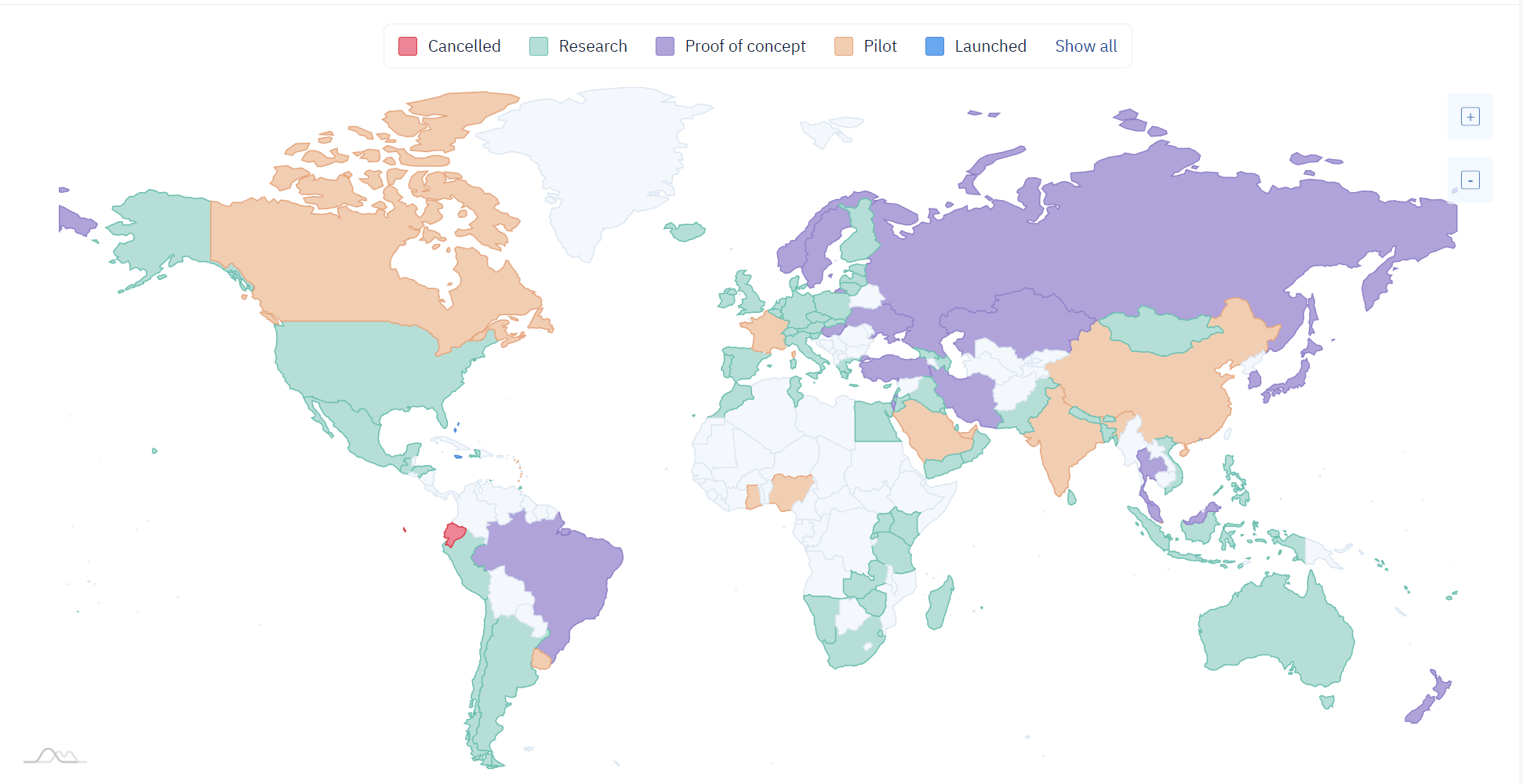 Volgens de laatste data zijn er op dit moment 109 landen in verschillende stadia van ontwikkeling van CBDC’s.